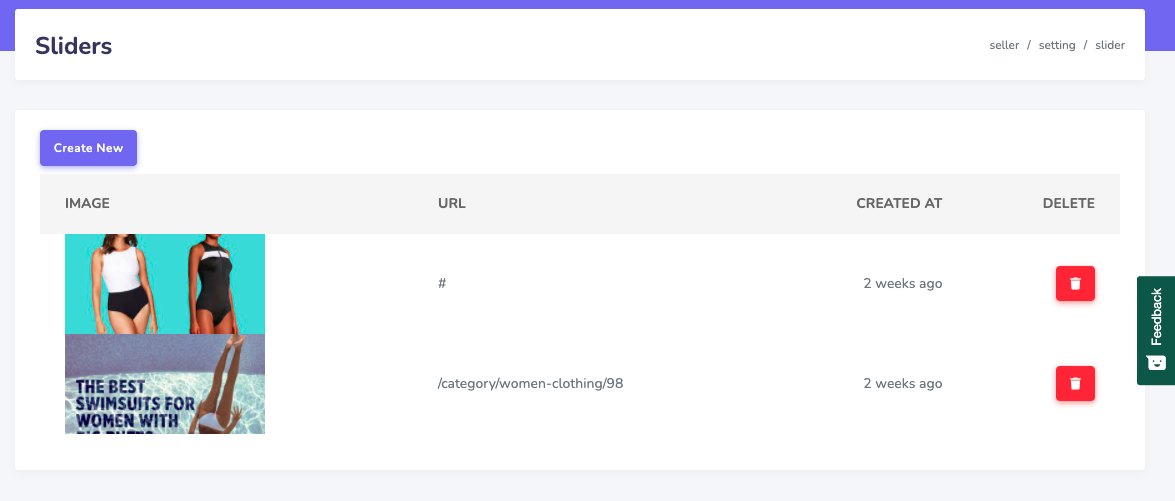 Once you click on sliders as seen above you we see the screen below which will contain the list of available slider images. Since it's the first time you are adding a slider click on create new button.